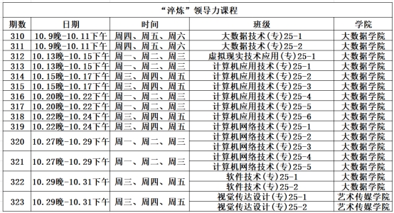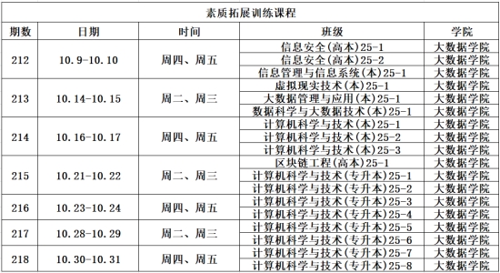 为有序推进我校各部门教育教学开展,便于各部门教师顺利落实教学工作,现将我校10月份素质拓展训练与“淬炼”领导力课程的安排公布,请各位老师及时查阅,并做好调停课安排。具体如下: